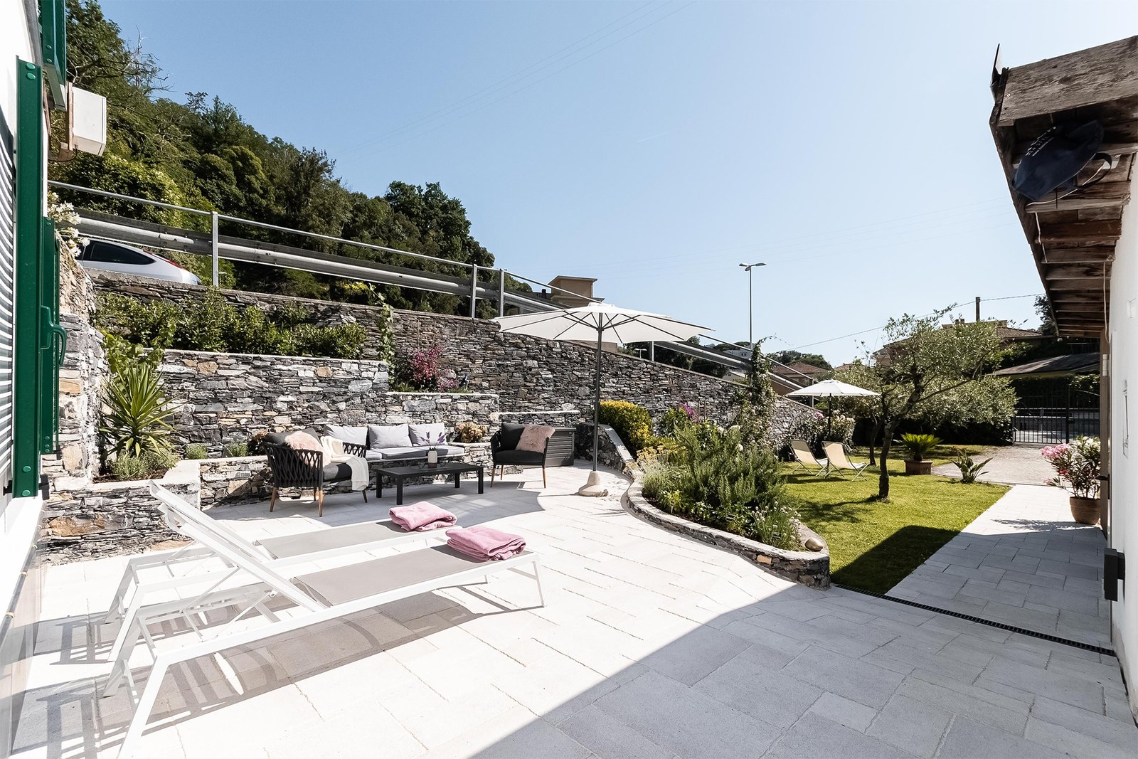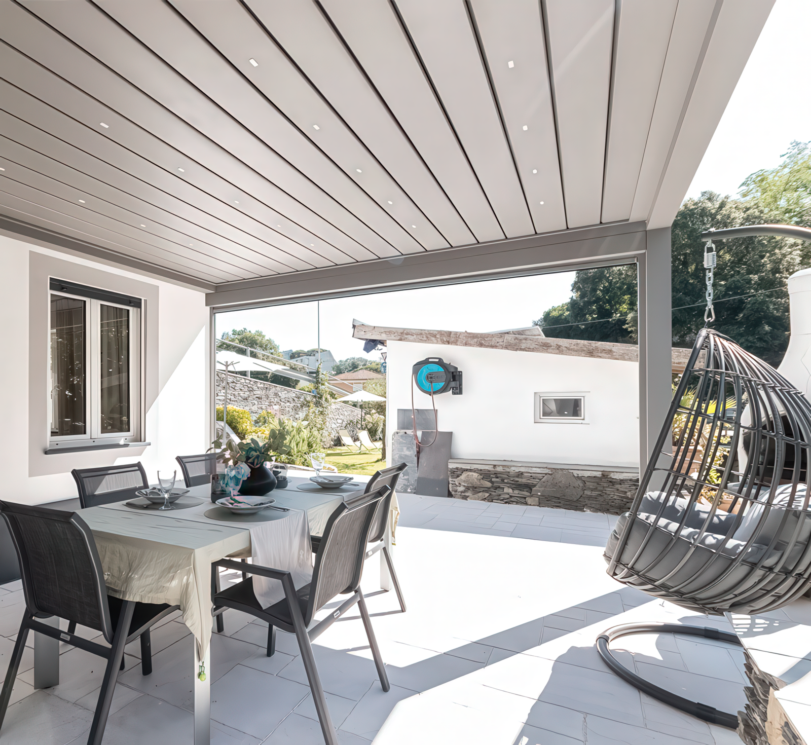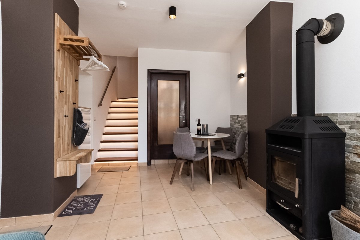 Von hier aus geht es ins Bad, ins Obergeschoss und zur überdachten Pergola.